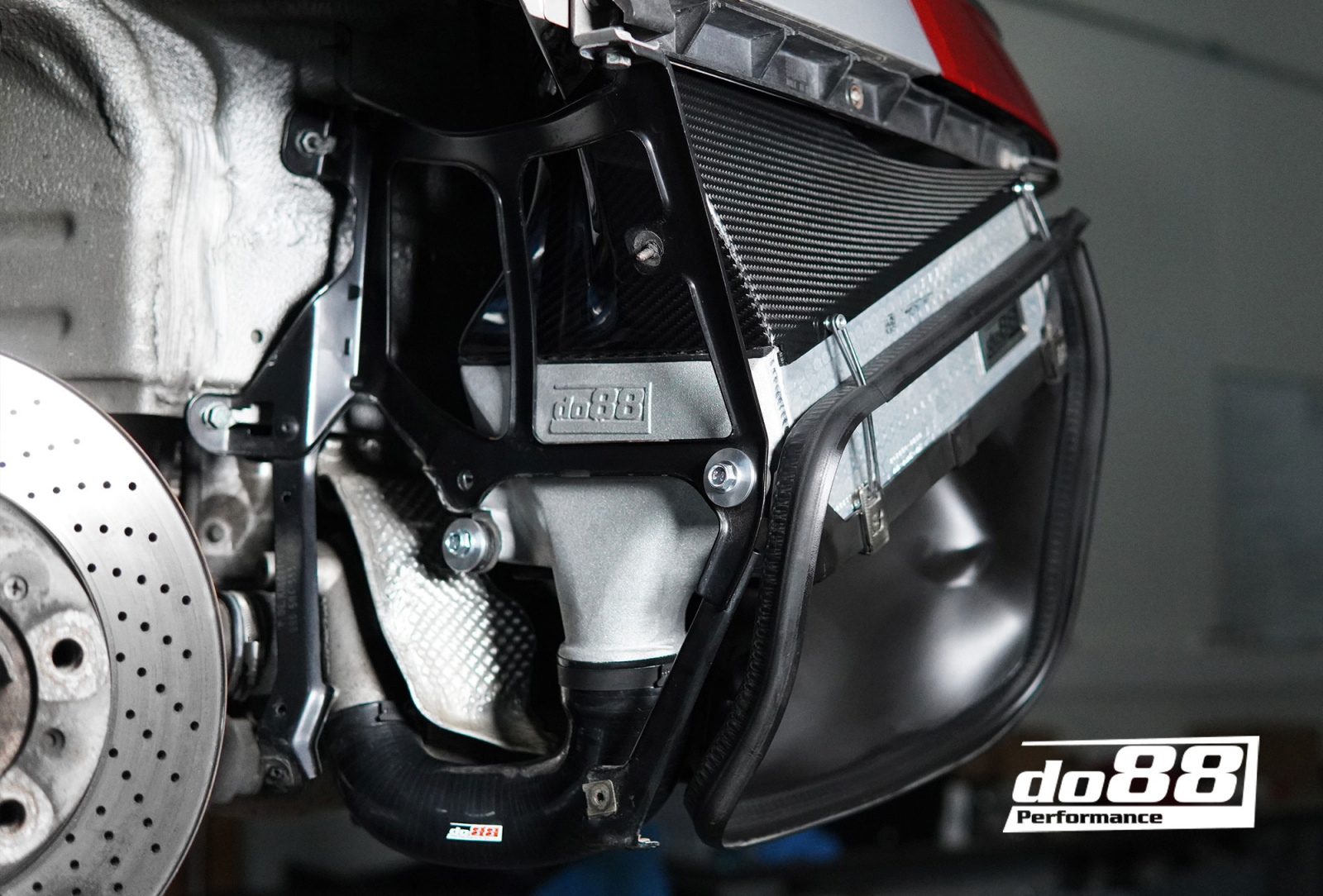 För att optimalt fördela flödet över hela cellpaketet tillämpar vi gjutna, flödesbekräftade tankar. En genomtänkt tankdesign är väsentlig för att maximera värmeöverföringsegenskaperna och flödet. Flöde och kylkapacitet beror direkt av cellpaketets dimensioner och för att utnyttja ett så tjockt paket som möjligt, har vi ersatt de överlägsna luftstyrningarna med kolfiberstyrningar. Dessa är utformade av do88 med 3D-scanning som grund, vilket garanterar en utmärkt passform mot både bilens konstruktion och våra större intercoolers.