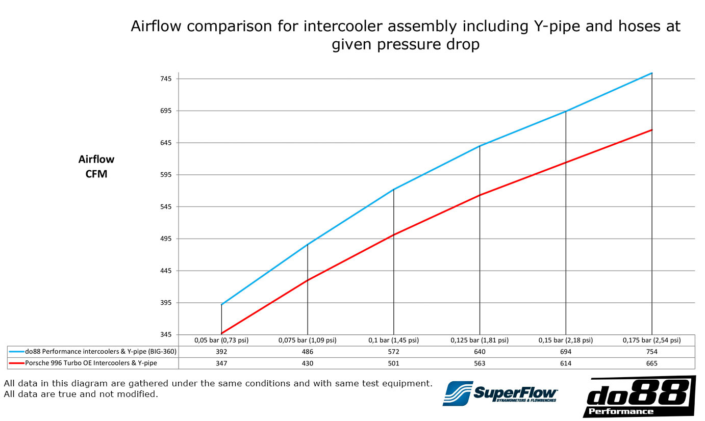 Med vår interna Superflow SF-1020 Probench flödesbänk, bekräftas luftflödet som ett komplett system, med slangar på både inlopp och utlopp, för både OEM 996 intercoolers och do88 prestandaintercoolers.