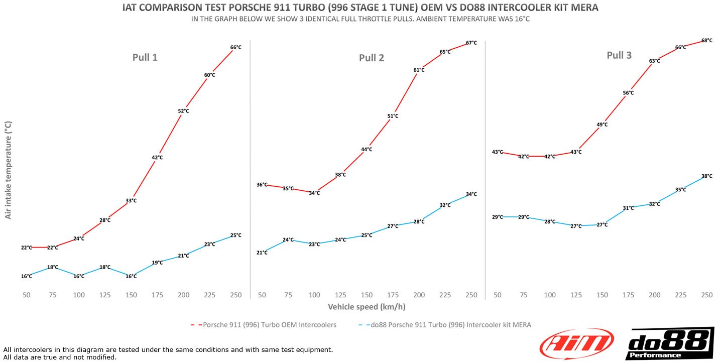 Gällande prestanda, sänker do88 intercoolers effektivt inloppstemperaturen! Diagrammet visualiserar skillnaden jämfört med de ursprungliga (OEM) 996 intercoolers.