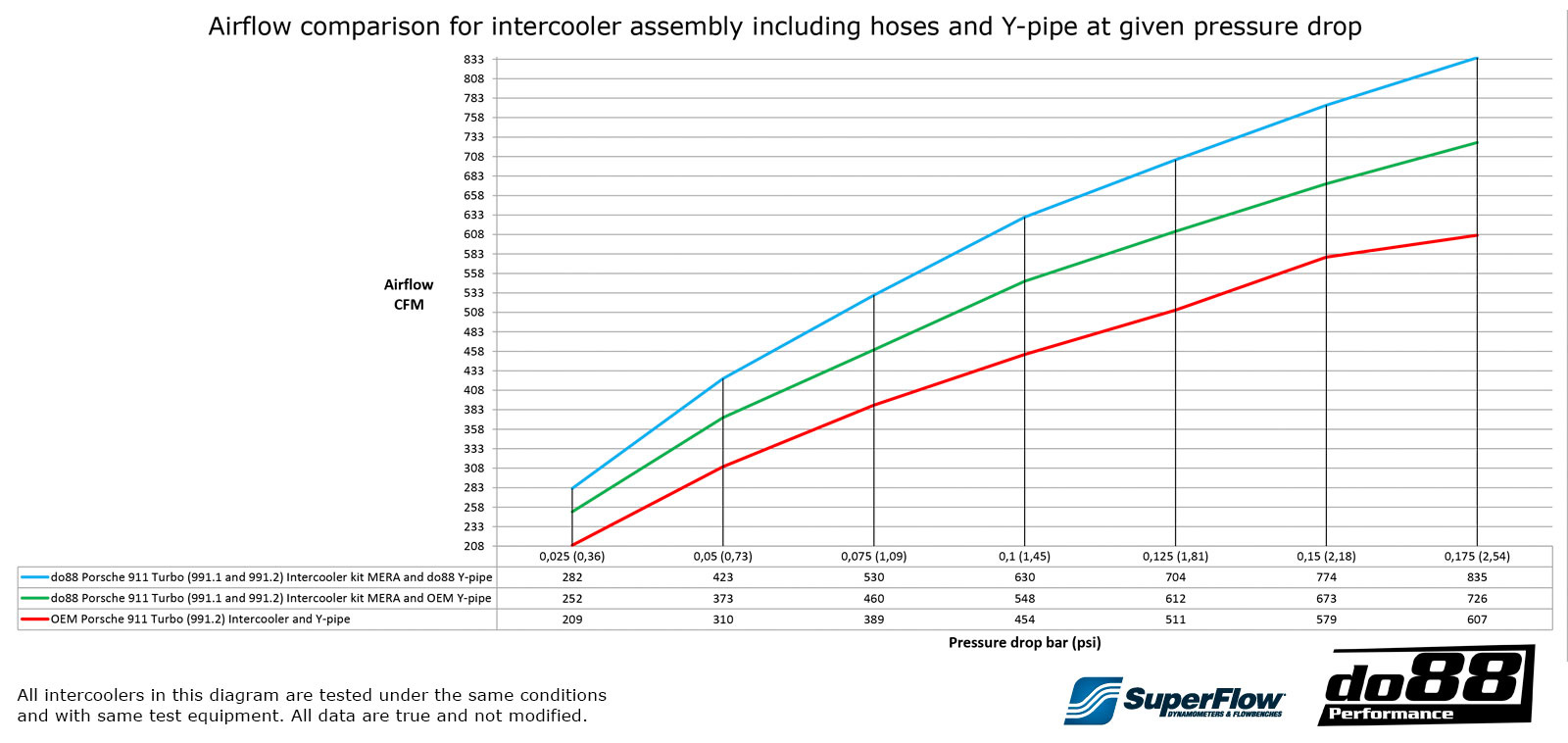 - Luftflöde vid 0,175 bar / 2,54 psi tryckfall: 835 CFM (607 CFM), 37% högre (do88 intercooler + y-rör vs OE intercooler + OE y-rör)! Se diagram under produktbilderna.
