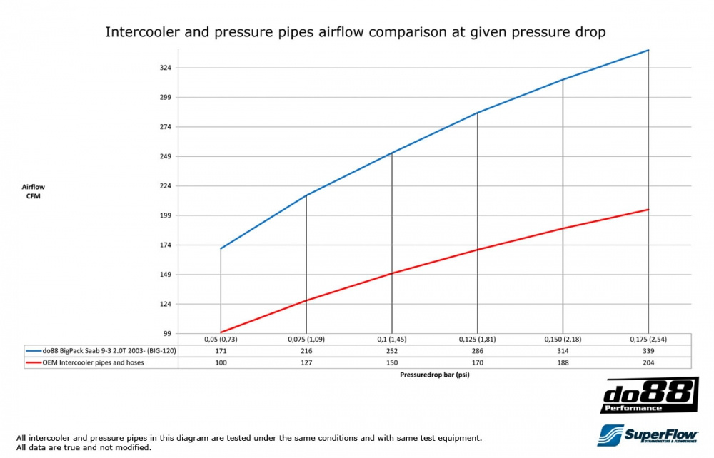 Detta paket är för dig som har höga effektmål och vill uppgradera till det absolut bästa! Att ”bara” byta till vår prestandaintercooler är en jättestor förbättring. Tillsammans med vårt tryckrör blir förbättringen enorm. Vårt tryckrör har avsevärt bättre flöde än original, detta har vi verifierat både i bil samt i vår egen SuperFlow SF-1020 flödesbänk.
