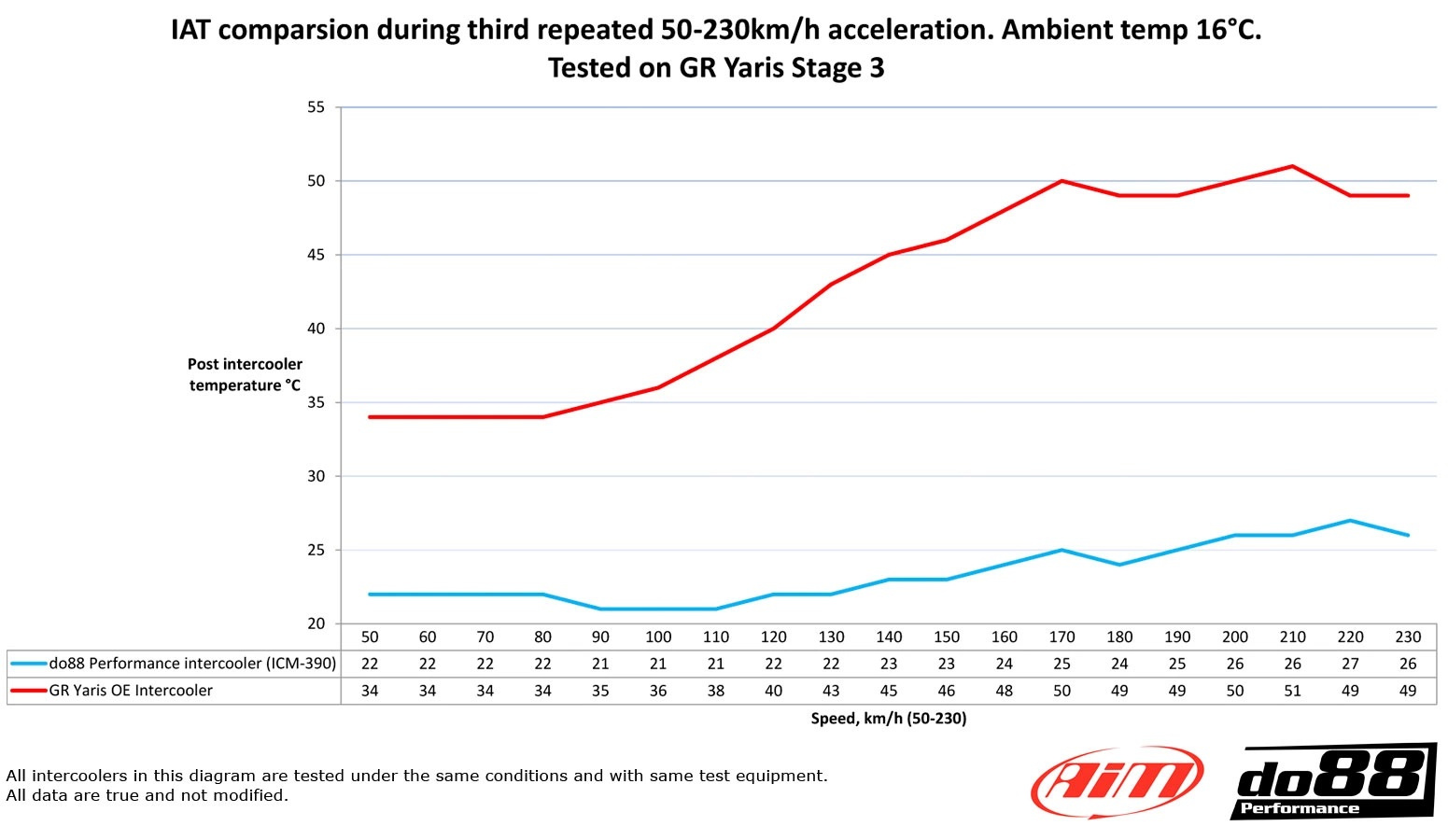 - Lägre temperatur efter intercooler vid samma testförhållanden: 25°C (50°C), 25°C lägre!