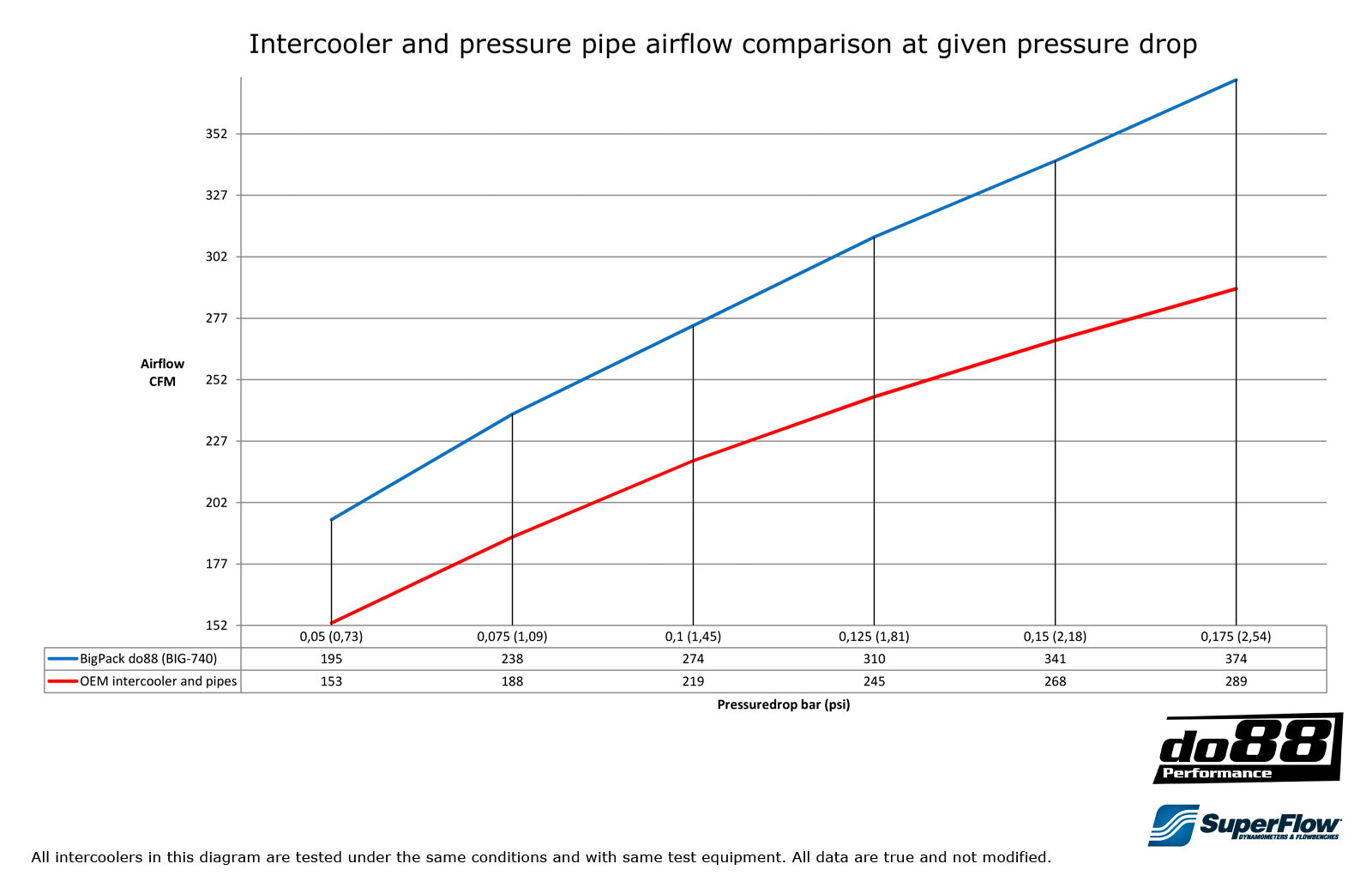 - Temperatur efter intercooler vid samma testförhållanden: 32°C (66°C), do88 34°C lägre!