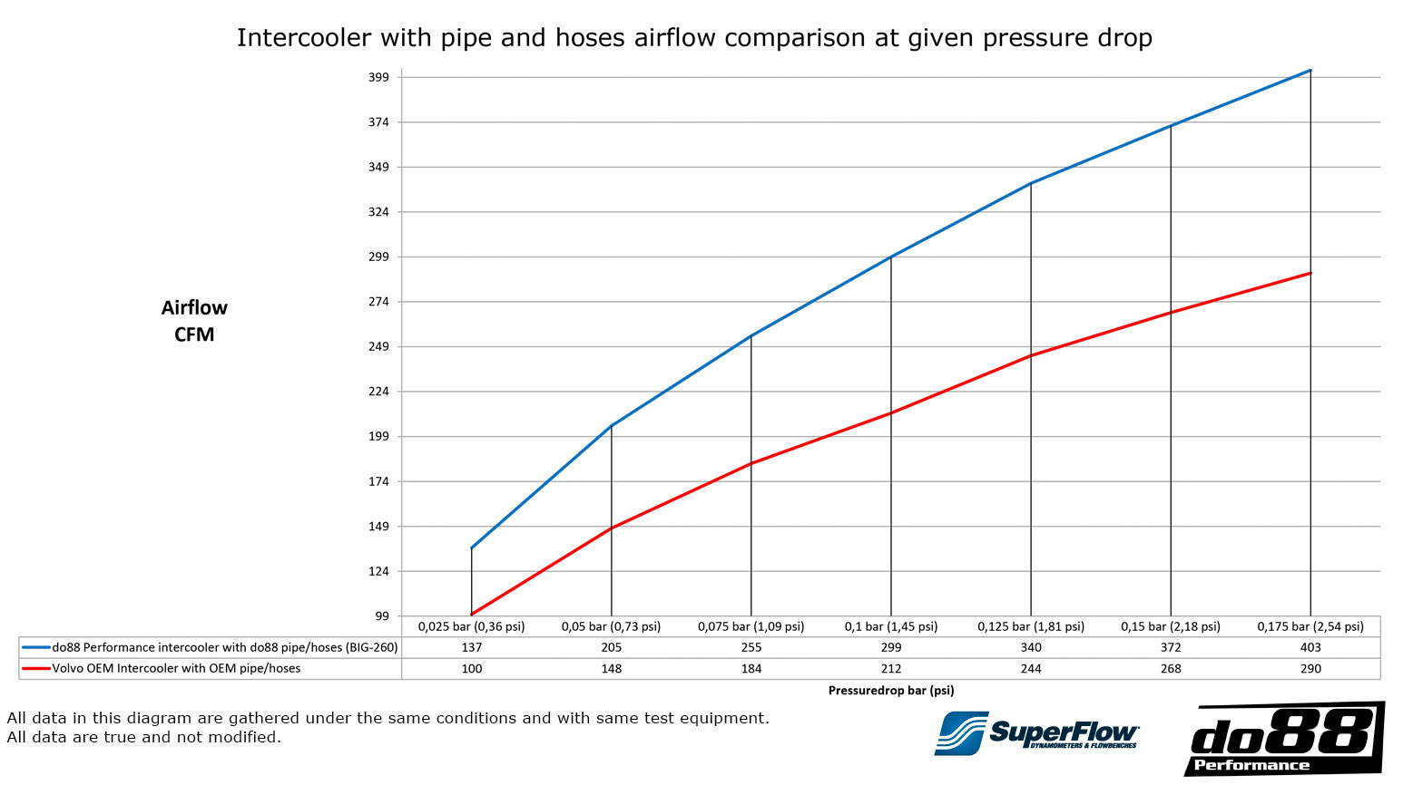 Detta paket är för dig som har höga effektmål och vill uppgradera till det absolut bästa! Att ”bara” byta till vår prestandaintercooler är en jättestor förbättring. Tillsammans med vårt tryckrör blir förbättringen enorm. Vårt tryckrör har avsevärt bättre flöde än original, detta har vi verifierat både i bil samt i vår egen SuperFlow SF-1020 flödesbänk.