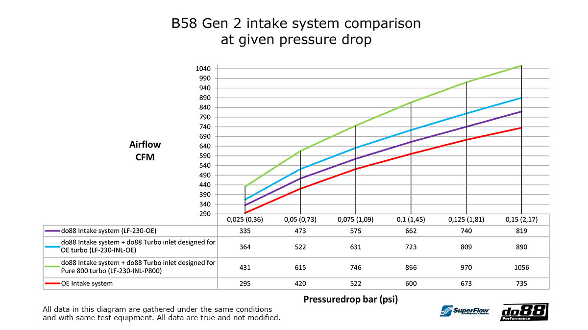 Tester genomförda i vår SuperFlow SF1020 flödesbänk, visar tydligt fördelen med det valfria turbo-inloppet. Insugssystemet ensamt erbjuder en betydande 15 % luftflödesökning. Men kombinerat med vårt Turbo-inlopp (för originalturbo), är den totala luftflödesökningen fantastiska 23 %! Vi rekommenderar starkt detta tillval.