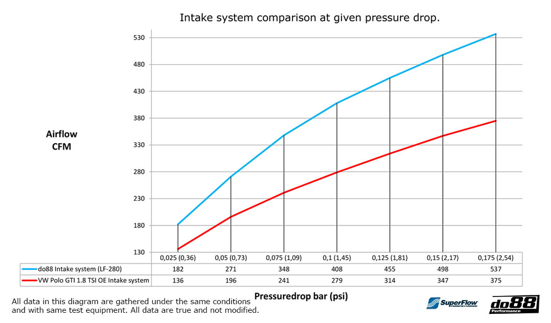 Tänkvärt är att original insugssystemet designades för den effekt bilen hade original. Vid höjning av effekten räcker kanske inte längre dess prestanda till och det slutar med att man får ett för stort undertryck på turbons sugsida som gör att motorns verkningsgrad sjunker och man förlorar effekt. Så redan vid höjt laddtryck / mjukvaruuppgradering / chipning kommer vårt insugssystem att ge förbättrad prestanda och effektivitet jämfört med originalinsugssystemet!