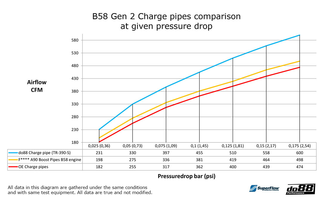 Det finns många eftermarknadstryckrör för B58-motorn på marknaden, men vår åsikt är att de flesta inte är korrekt designade. Det flesta konkurrenter har gjort en mycket simpel design där det under och övre tryckrören kopplas samman med en rak reducerande silikonslang. Det är uppenbart att de inte har förstått att denna slangkoppling måste vara lite flexibel för att kunna ta den termiska rörelsen i mellan rören. Denna vanliga design kommer högst troligen att orsaka problem med att slangen glider av slanganslutningarna eftersom den inte tillåter rörelse ifrån temperaturförändringarna. En naturlig lösning på detta problem är att folk drar åt slangklämmorna hårdare, men detta kommer i de flesta fall förstöra och deformera slanganslutningen på röret, vilket gör rören oanvändbara.