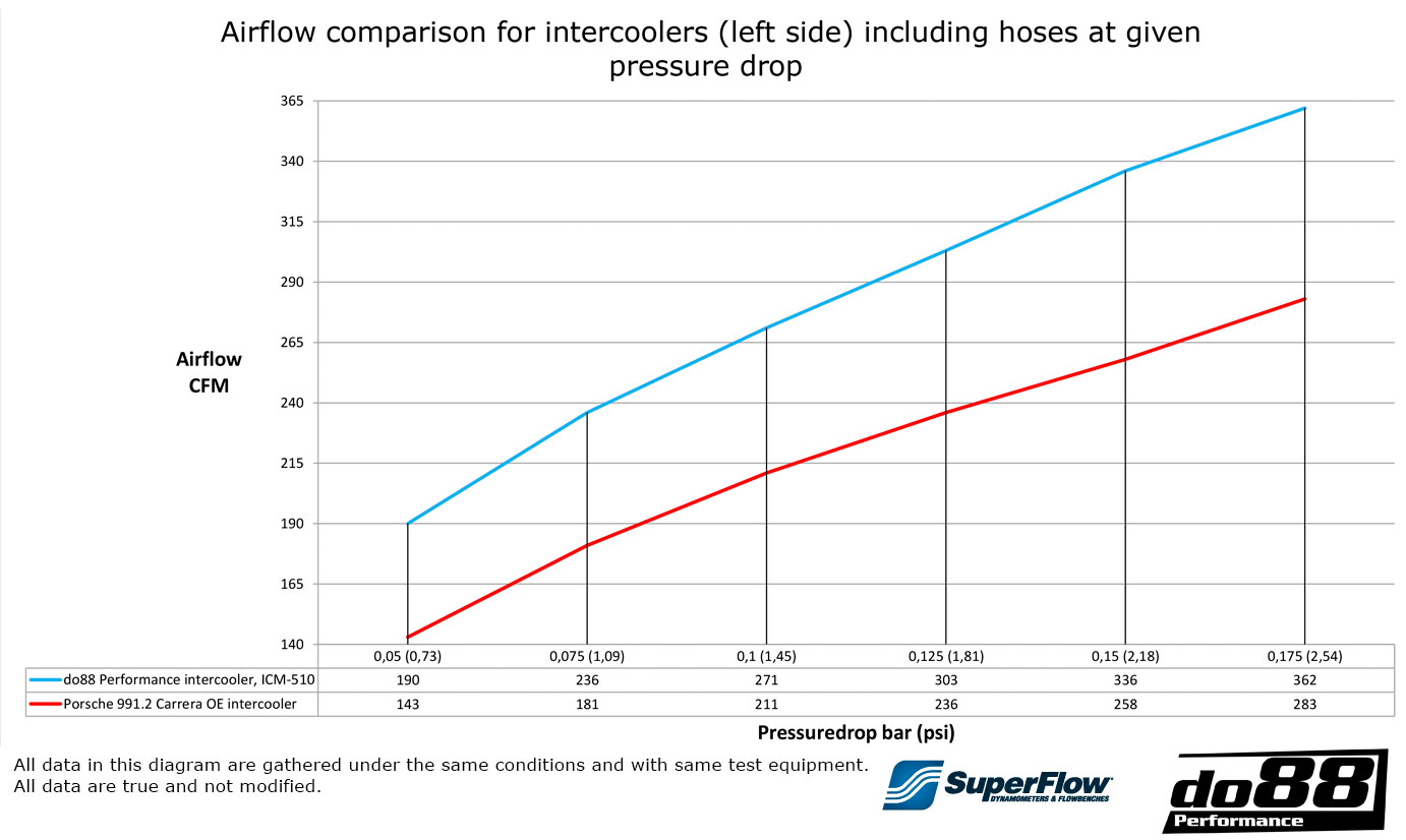 Med vår in-house Superflow SF-1020 Probench flödesbänk, verifieras luftflödet som ett komplett system, med slangar på både inlopp och utlopp, för både OEM 991 intercoolers och do88 prestandaintercoolers.
