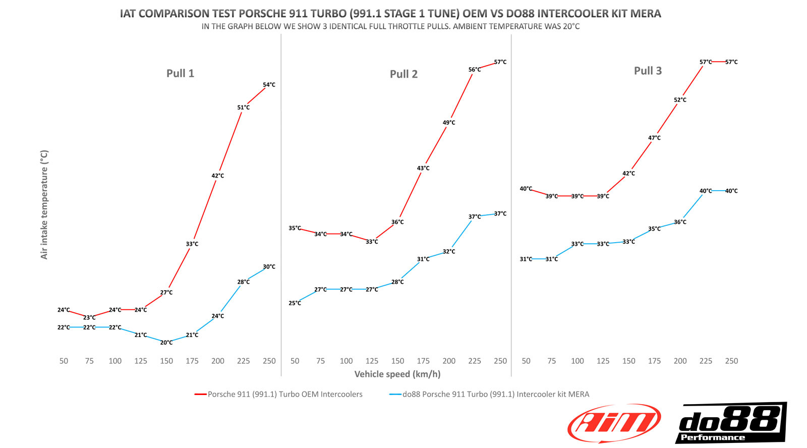 Beträffande prestanda ger do88:s intercoolersats en påtaglig sänkning av inloppstemperaturen! I grafen nedan syns skillnaden mot 991 OEM-intercoolern. Alla data är insamlade med vår AIM racelogger under 5 direkt efterföljande körningar. Fullgasacceleration från 50-250 km/h i en Porsche 991 med steg 1 mjukvara. Ingen avkylning mellan körningarna, bara fullt ös! Under alla körningar var AC:n avstängd, Sport Plus aktiverat.