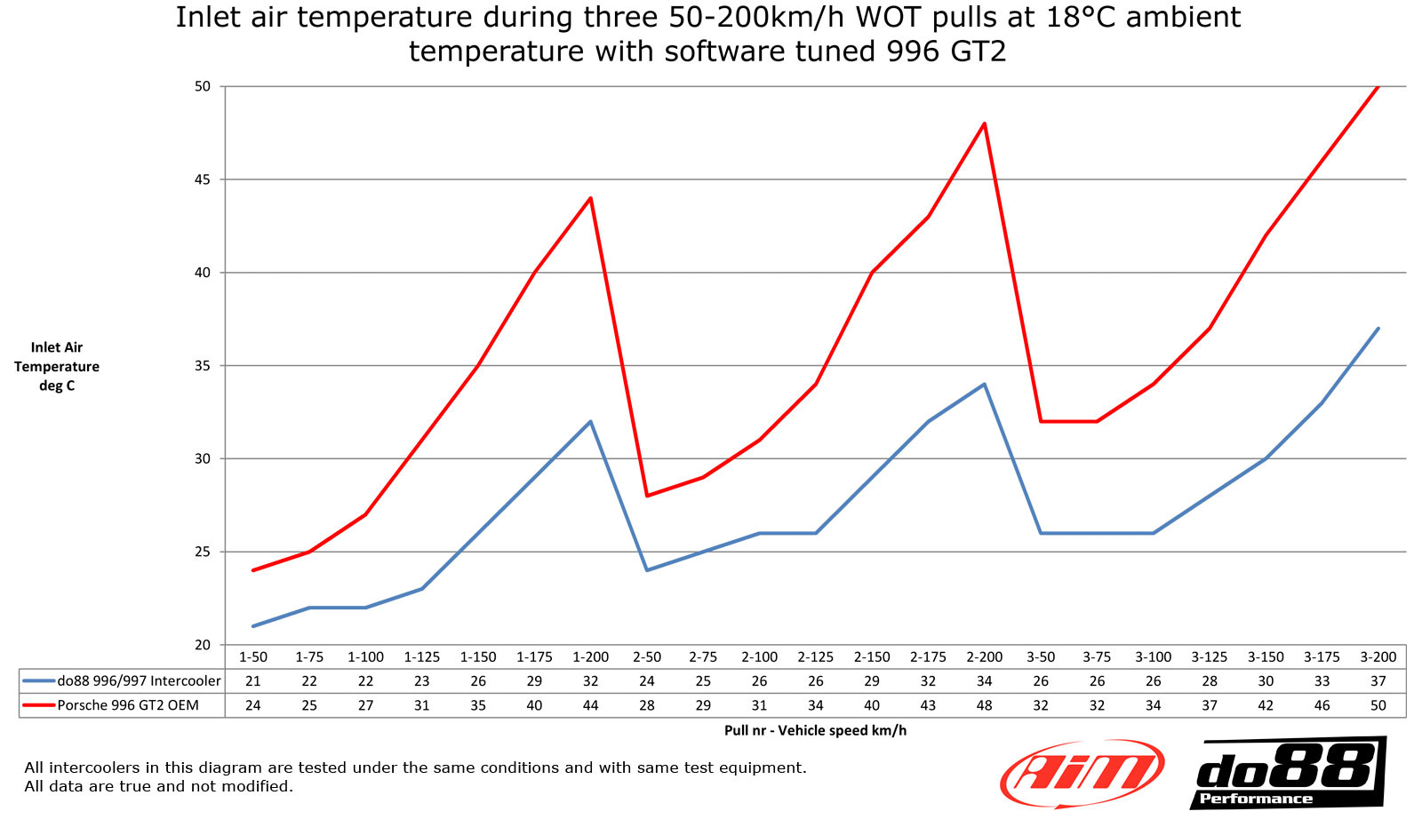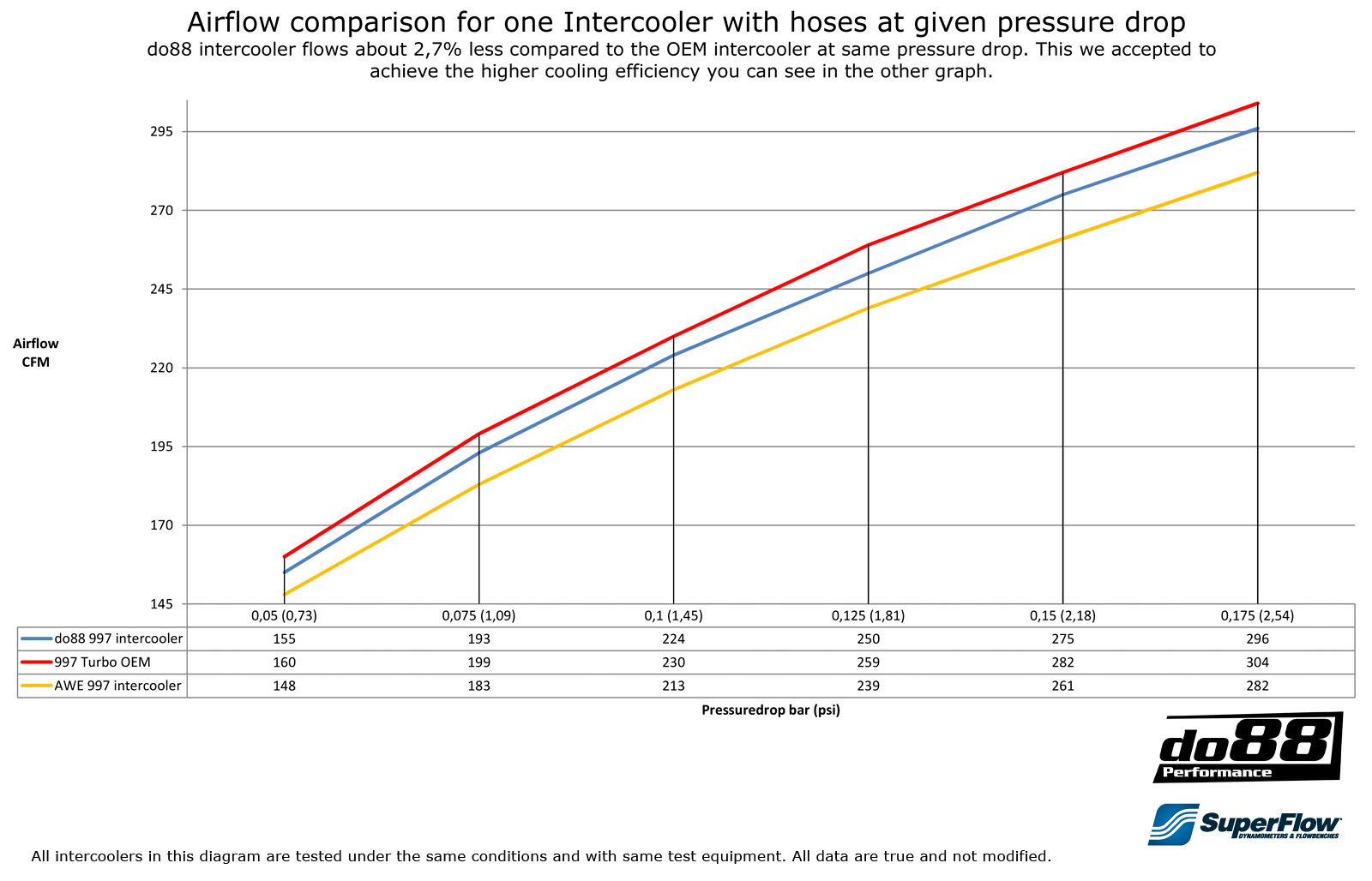 - Lägre temperatur efter intercooler vid samma testförhållanden: do88 34°C, original 50°C.