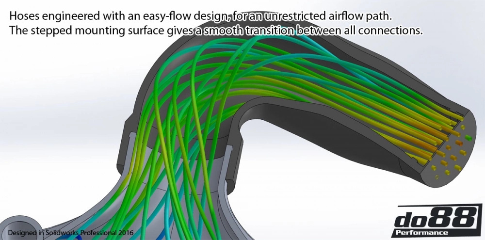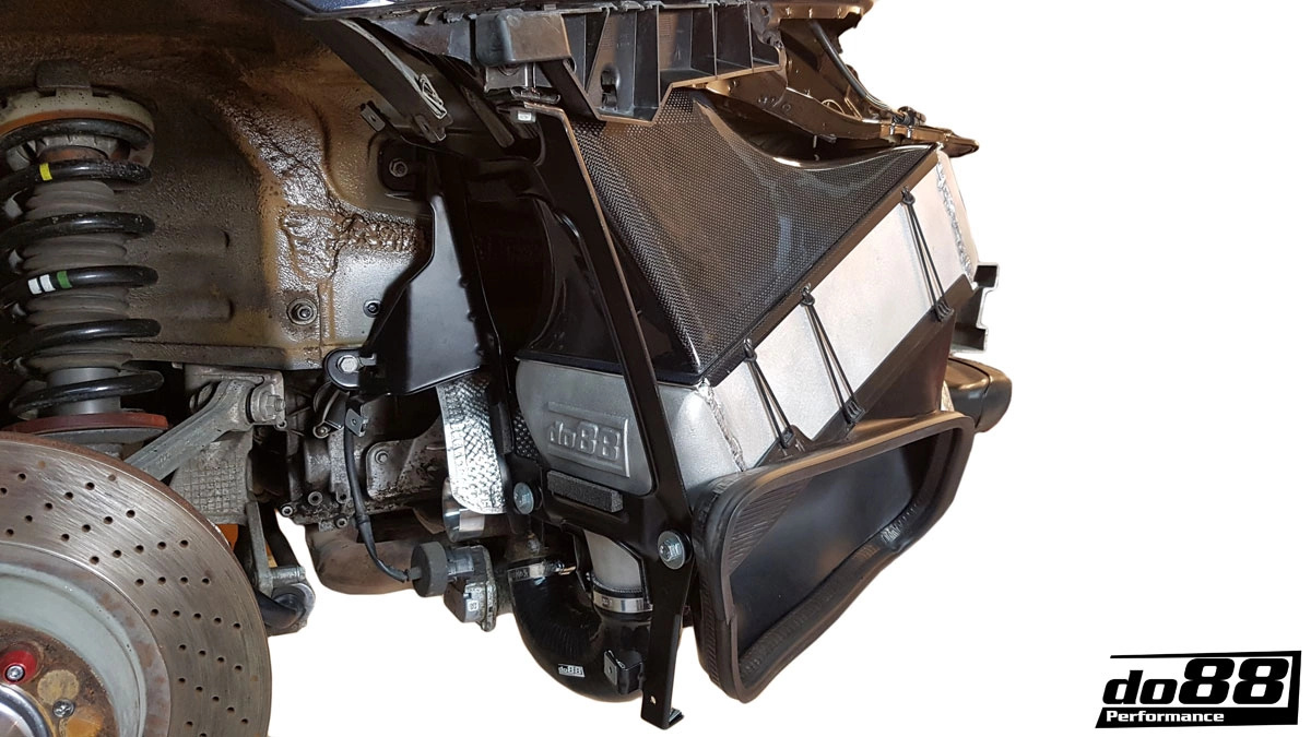 Cellpaketet är nytt, men tankar, slangar och tillbehör är samma som innan. För att verkligen kunna distribuera flödet över hela cellpaketet använder vi gjutna, flödesverifierade tankar. En väldesignad tankform är avgörande för att helt kunna dra nytta av värmeöverföringsegenskaperna samt för att maximera flödet. Flöde och kylning är också direkt beroende av cellpaketets storlek och för att kunna använda ett så tjockt paket som möjligt ersätts de övre luftstyrningarna med kolfiberstyrningar, designade av do88 med 3D-scanning som grund. Detta garanterar passform mot både bilens konstruktion samt våra grövre laddluftkylare. För att maximera effekterna av värmeöverföringen levereras dessa luftstyrningar med ordentliga tätningslister mot både intercooler och kaross, så att den kylande luften inte tar lättaste vägen förbi cellpaketet. Anslutningarna på intercoolern är hela 70 mm för att maximera flödet och eliminera flaskhalsar i systemet. Detta medför att denna sats levereras med nya slangar på alla fyra positioner, samtliga designade och CFD-testade för att uppnå optimalt flöde. Slangarna på turbokompressorns utlopp är tillverkade av material med särskilt hög värmetålighet, klassade till 240°C ihållande temperatur.