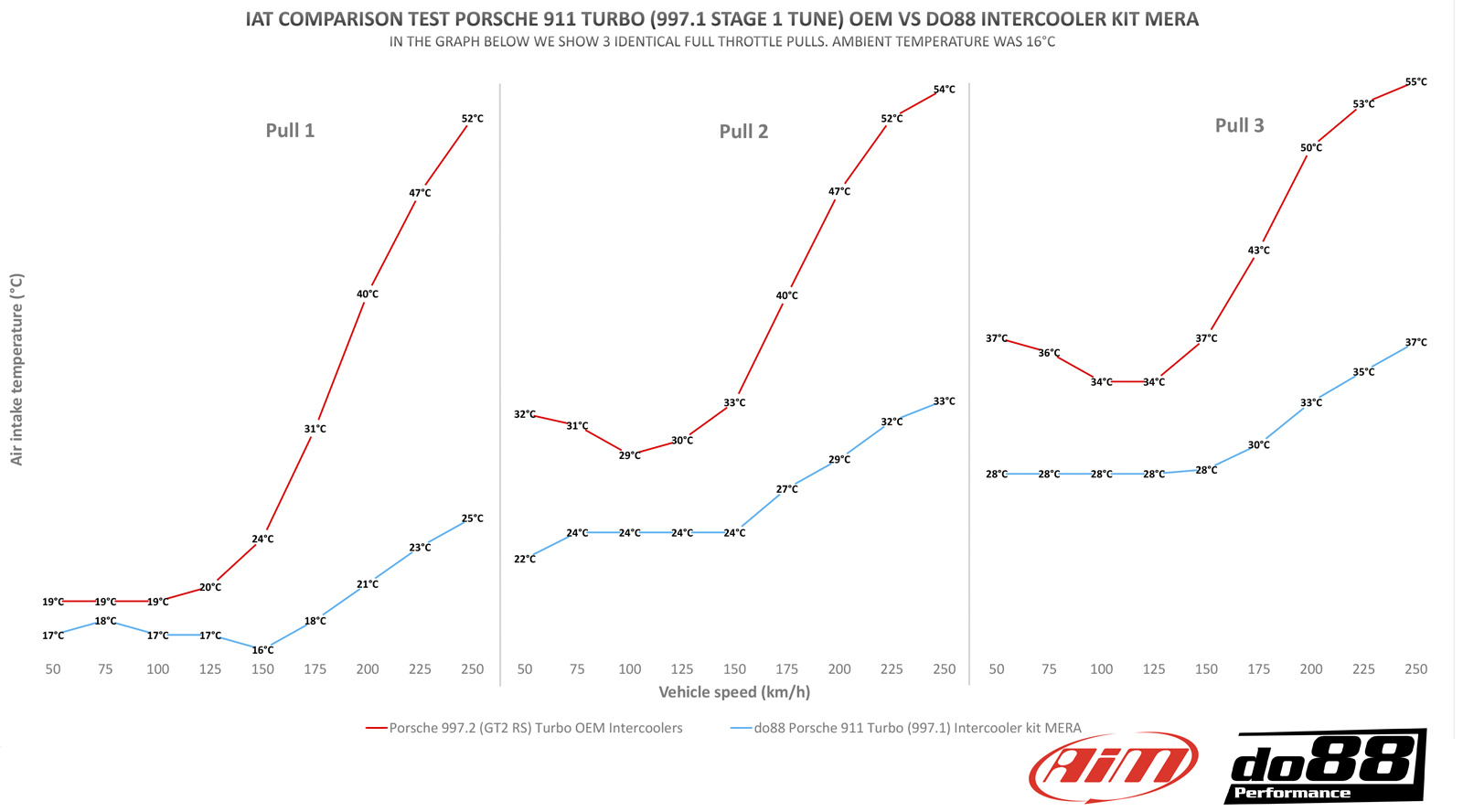Beträffande prestanda ger do88:s intercoolersats en påtaglig sänkning av inloppstemperaturen! I grafen nedan syns skillnaden mot 997.2 OEM-intercoolern. Alla data är insamlade med vår AIM racelogger under 5 direkt efterföljande körningar. Fullgasacceleration från 50-250 km/h i en Porsche 997 med steg 1 mjukvara. Ingen avkylning mellan körningarna, bara fullt ös! Under alla körningar var AC:n avstängd, Sport Plus aktiverat.