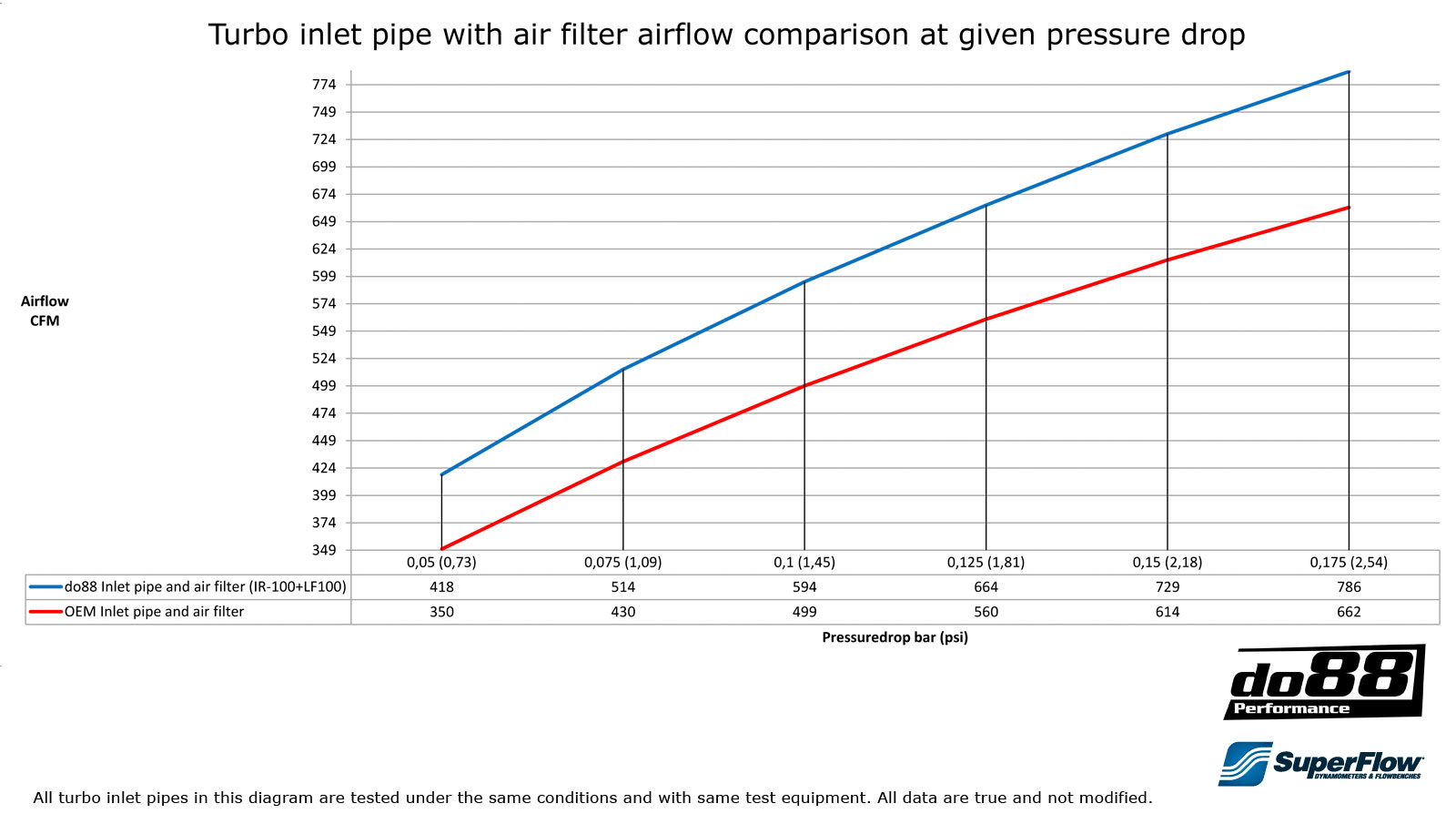 do88 insugssystem har ett luftflöde vid 0,125bar tryckfall på 664CFM*, att jämföras med originalsystemet som har 560CFM!