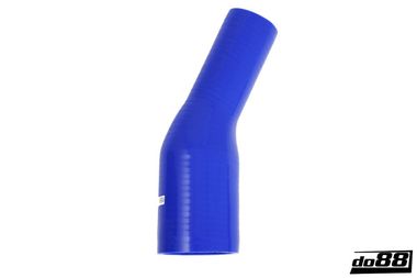 Blå 25 graders böjd reducerande silikonslang. Denna slang har olika innerdiameter i de båda ändarna. Slangen kan används till tryckapplikationer såsom turbo till intercooler samt sugapplikationer som luftfilter till insug mm. Passar även bra för att transportera kylvätska i kylsystem.