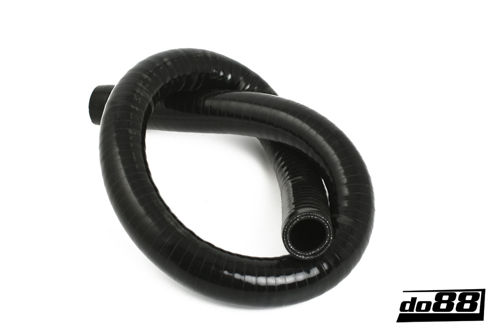 Jämfört med vanlig silikonslang så är denna flexibla slang tillverkad med en invävd stålspiral i armeringen. Detta ger slangen flexibilitet och högt sprängtryck. Denna slang är på grund av dess släta utsida inte lika flexibel som vår andra flexibla silikonslang som har en spår i lagens utsida. Läs minsta böjningsradie och jämför på respektive produkt.