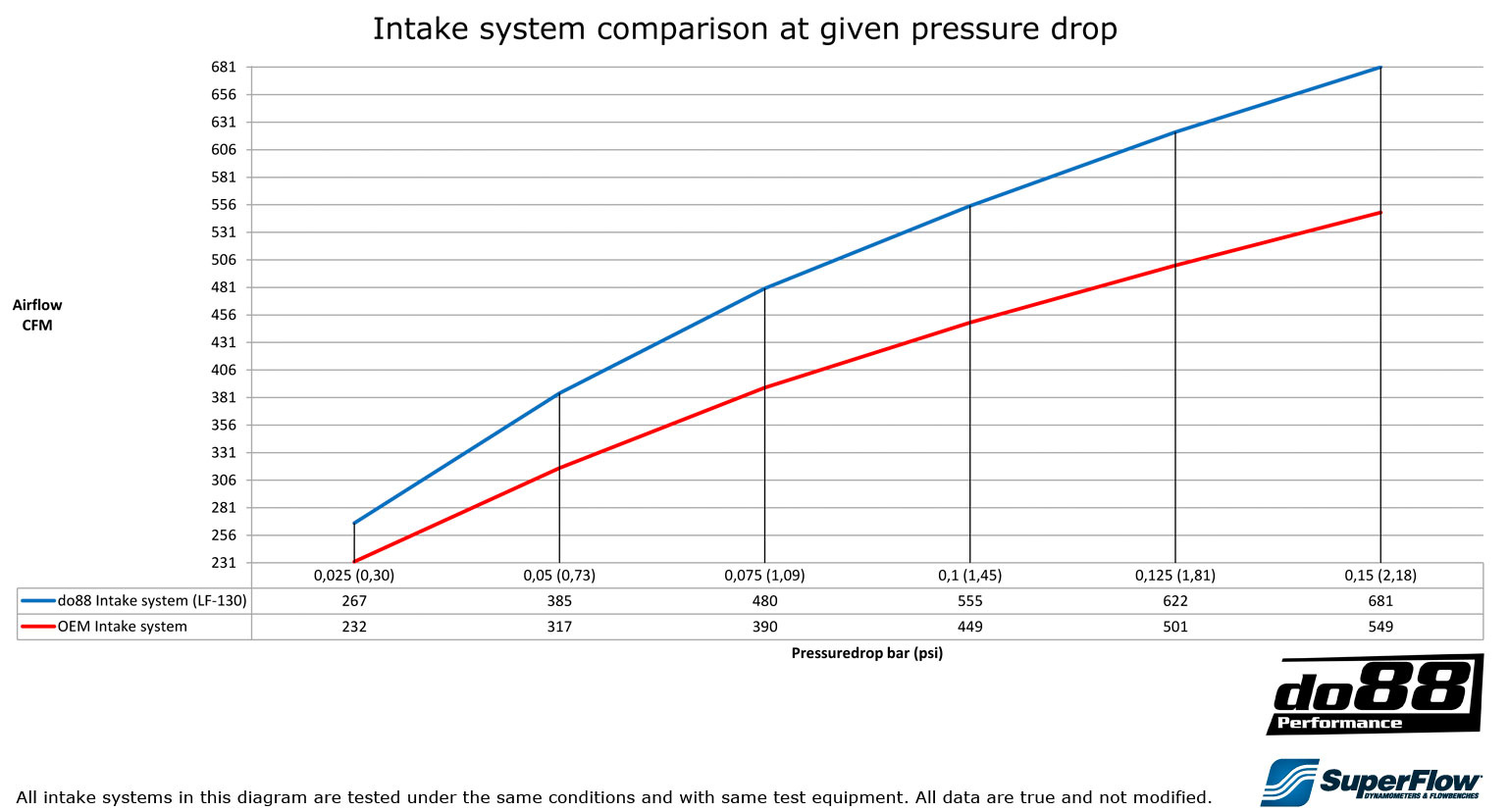 Tänkvärt är att original insugssystemet designades för den effekt bilen hade original. Vid höjning av effekten räcker kanske inte längre dess prestanda till och det slutar med att man får ett för stort undertryck på turbons sugsida som gör att motorns verkningsgrad sjunker och man förlorar effekt. Så redan vid höjt laddtryck / mjukvaruuppgradering / chipning kommer vårt insugssystem att ge förbättrad prestanda jämfört med originalinsugssystemet!