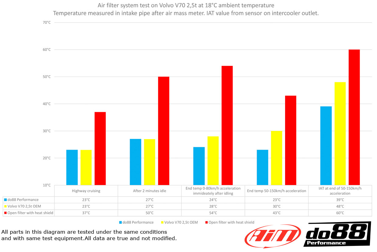 - 9°C grader lägre insugstemperatur efter intercoolern än original och 21°C grader lägre än ett öppet filter med värmesköld monterat