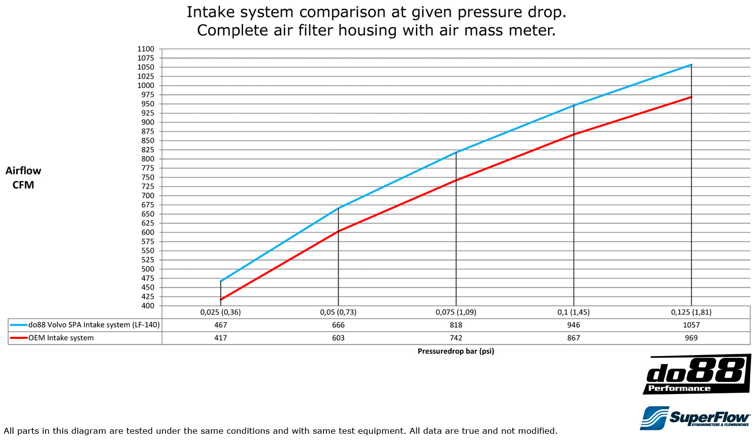 Tänkvärt är att original insugssystemet designades för den effekt bilen hade original. Vid höjning av effekten räcker kanske inte längre dess prestanda till och det slutar med att man får ett för stort undertryck på turbons sugsida som gör att motorns verkningsgrad sjunker och man förlorar effekt. Så redan vid höjt laddtryck / mjukvaruuppgradering / chipning kommer vårt insugssystem att ge förbättrad prestanda jämfört med originalinsugssystemet!