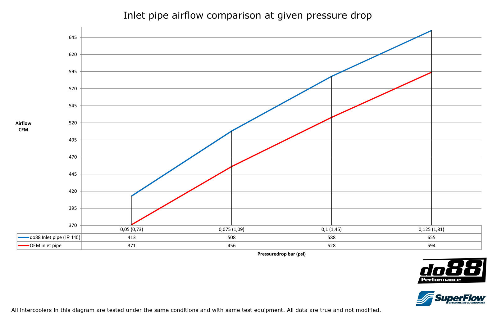do88 inloppsrör har ett luftflöde vid 0,125bar tryckfall på 655CFM, att jämföras med originalröret som har 594CFM. Inloppsröret är tillverkat av 3” extruderat aluminiumrör som dornbockats i ett stycke till rätt form! Specialdesignade silikonslangar av högsta kvalitet med 4 lagers polyester/aramid armering för att klara av höga temperaturer och undertryck.