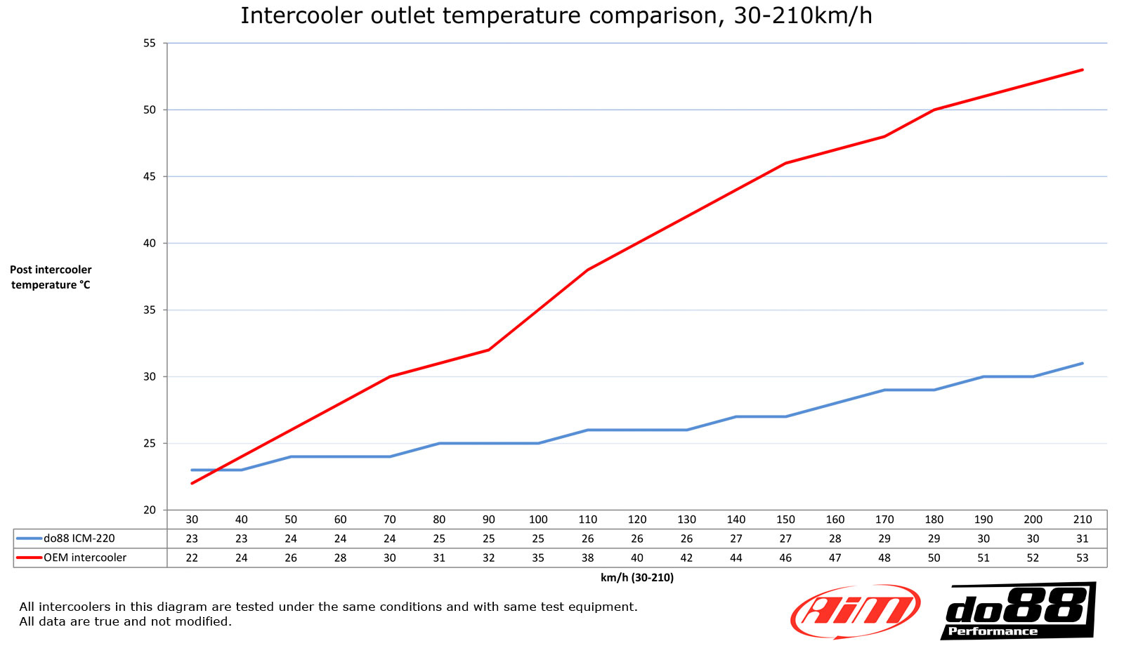 - Lägre temperatur efter intercooler vid samma testförhållanden: 31°C (53°C), 22°C lägre!